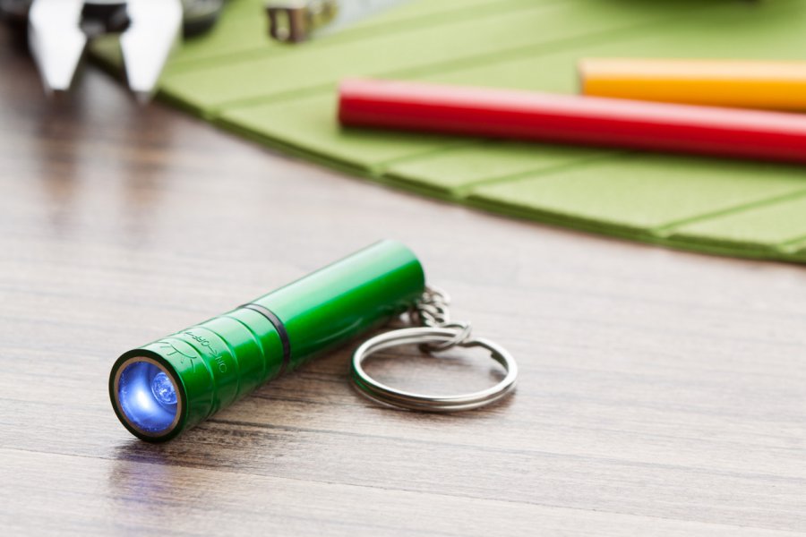 Plastová mini baterka s 1 LED, kovovým povrchem a kovovým kroužkem na klíče. S knoflíkovou baterií.
