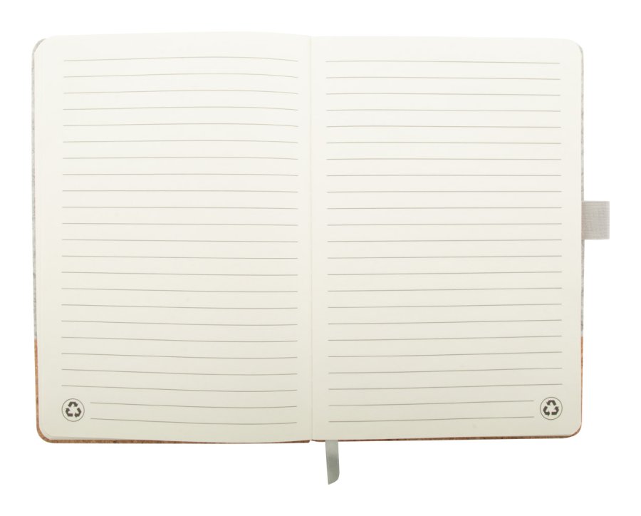 Blok A5 z RPET plsti a přírodního korku s 80 linkovanými listy z recyklovaného papíru. Se záložkou, gumovým páskem a držákem na pero.
