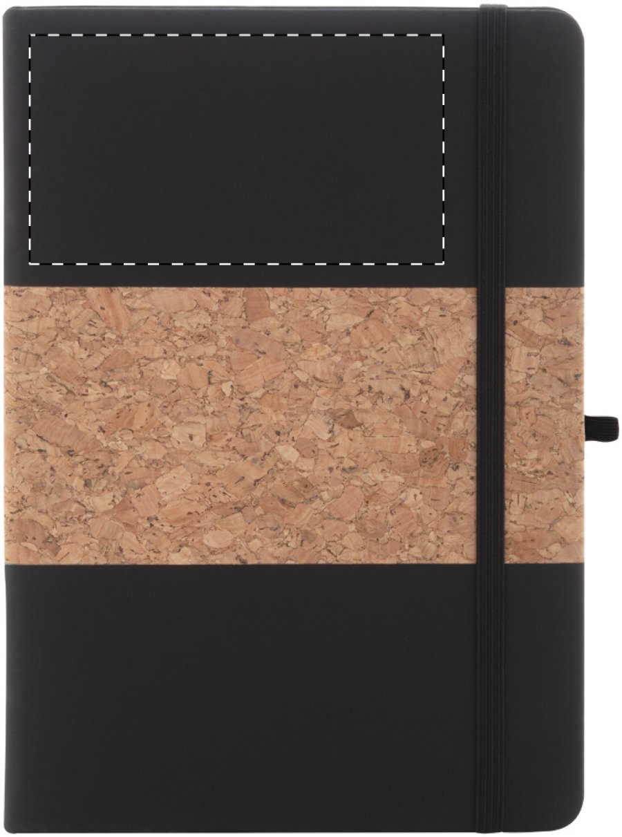 Blok A5 potažený přírodním korkem a recyklovanou PU kůží se záložkou v odpovídající barvě, gumičkou a držákem na pero. S 80 linkovanými listy z recyklovaného papíru.