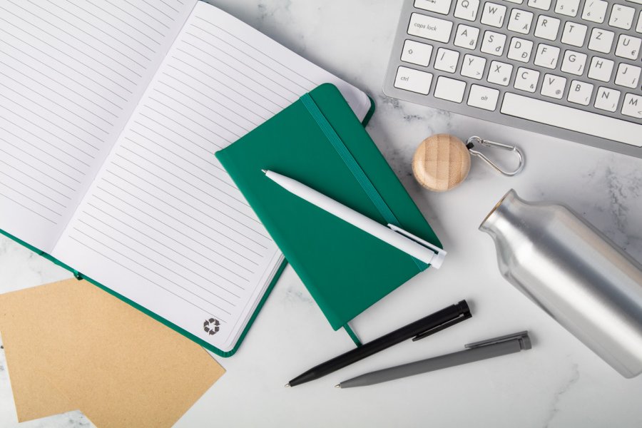 Blok potažený recyklovanou PU kůží se 100 linkovanými listy z recyklovaného papíru. Se záložkou v odpovídající barvě a gumičkou. Velikost A6.