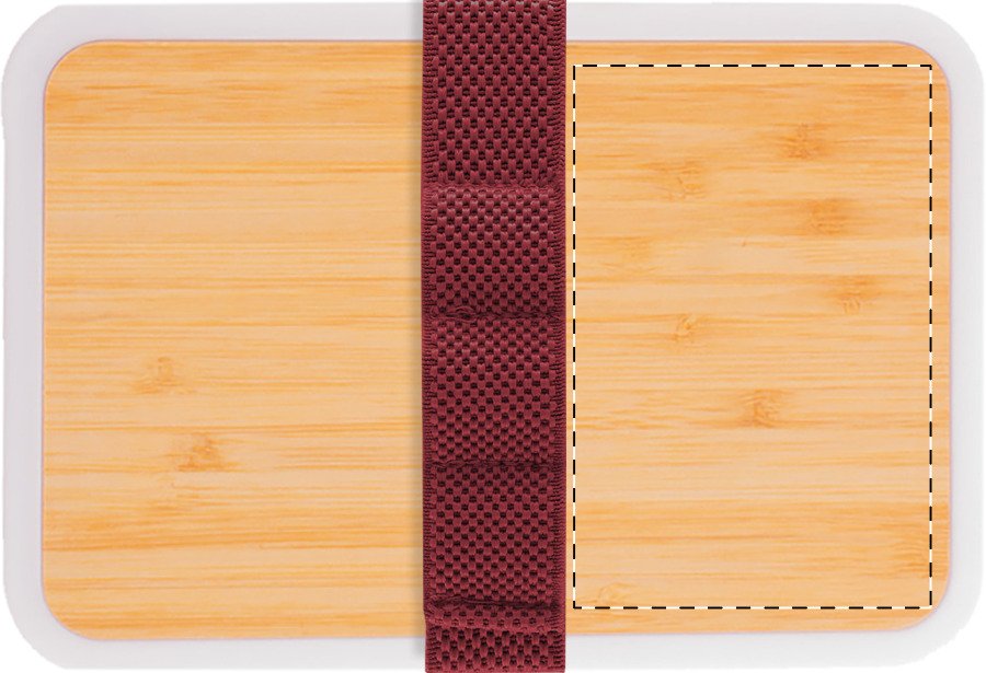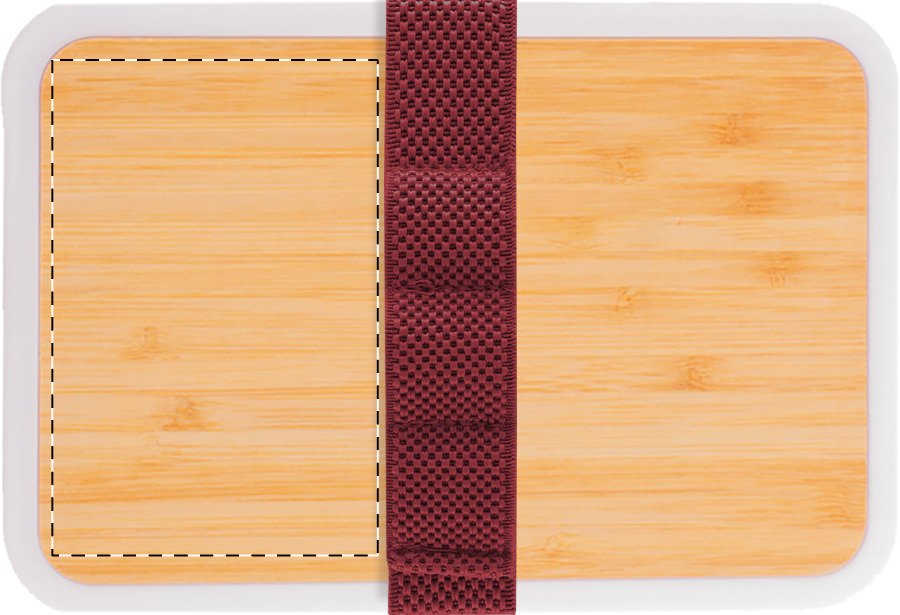 Box na jídlo z recyklovaného PP plastu s bambusovým víkem, sadou příborů (nůž a vidlička) a elastickým páskem. 500 ml.