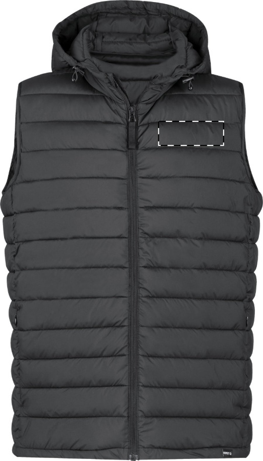 Větru a vodě odolná vesta na zip s bočními kapsami na zip a nastavitelnou kapucí. S polyesterovým pouzdrem RPET. 100% RPET polyester s výrazným štítkem RPET.