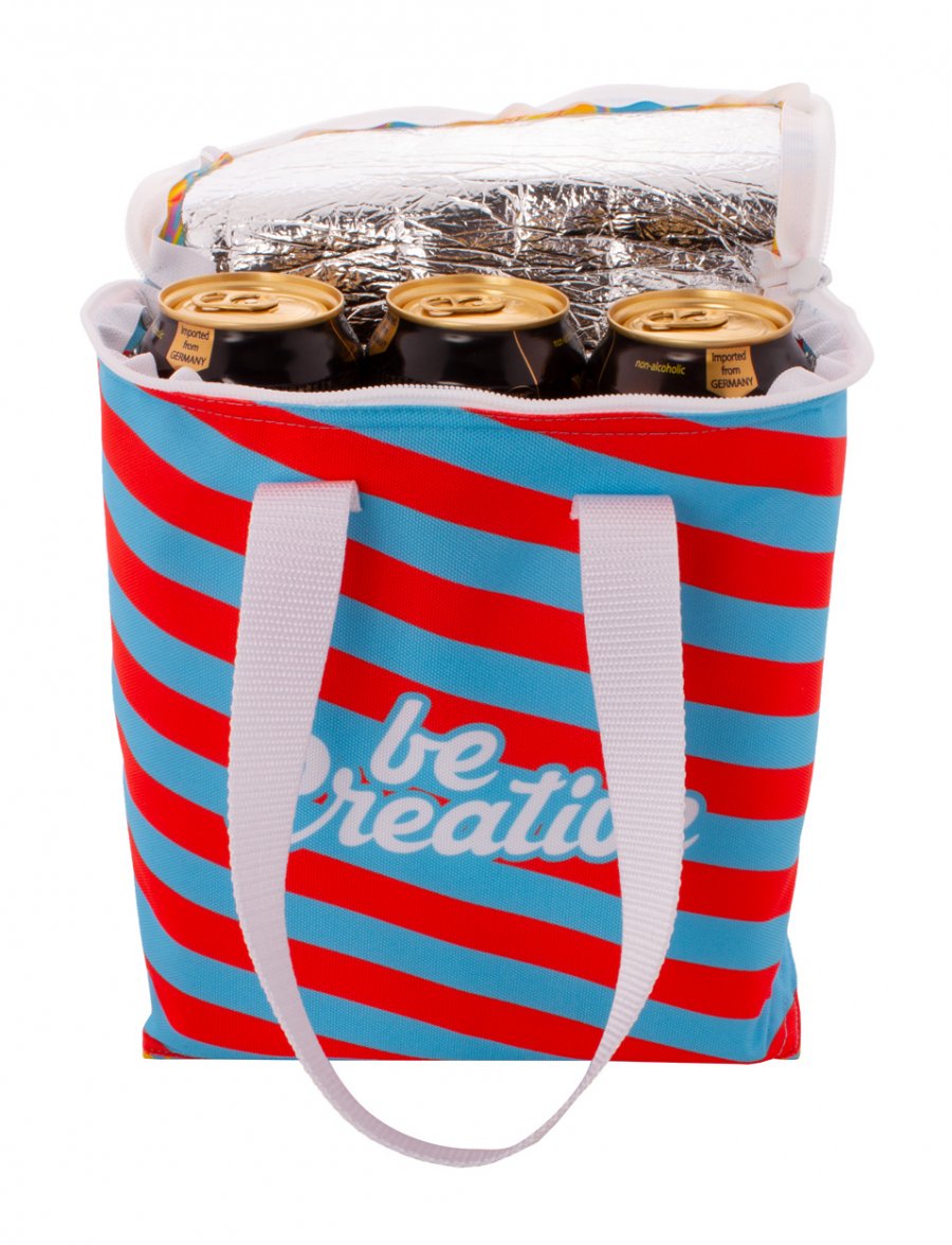 Na zakázku vyrobená chladicí taška na zip z 600D RPET polyesteru s hliníkovou výplní pro 6 ks 0,33 l plechovek. S celoplošně tištěnou sublimační grafikou a výrazným štítkem RPET, cena nezahrnuje tiskovou přípravu. Min. mn.: 25 ks.