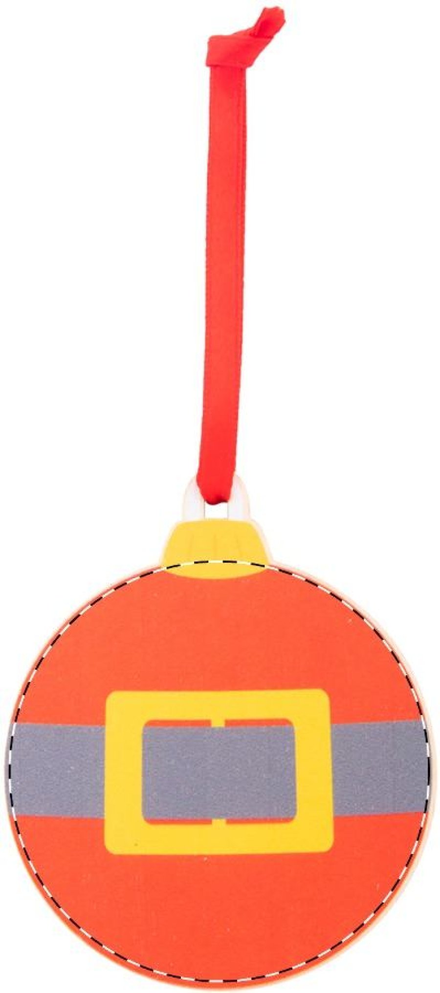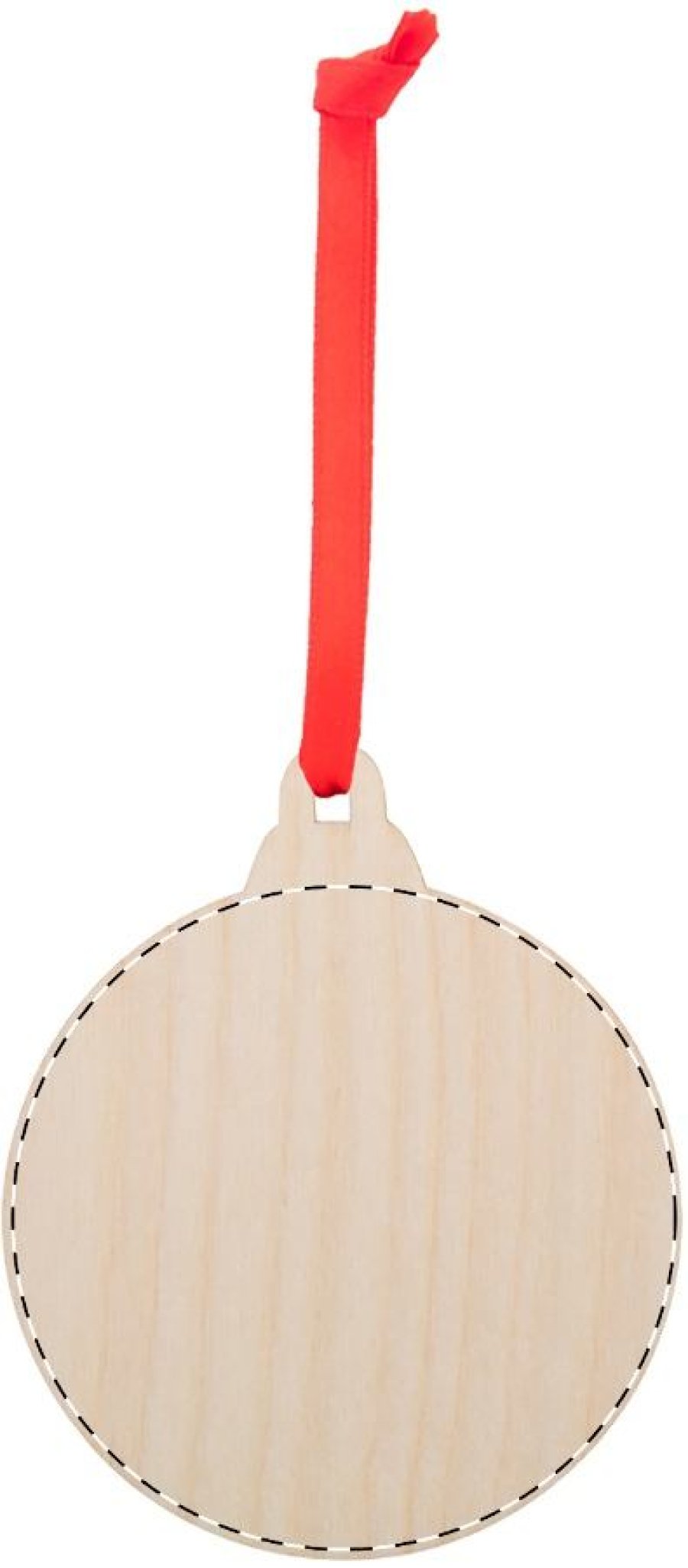 Vánoční ozdoba z březové překližky, s tištěným vánočním designem a červenou stužkou, která je dodávána zvlášť.