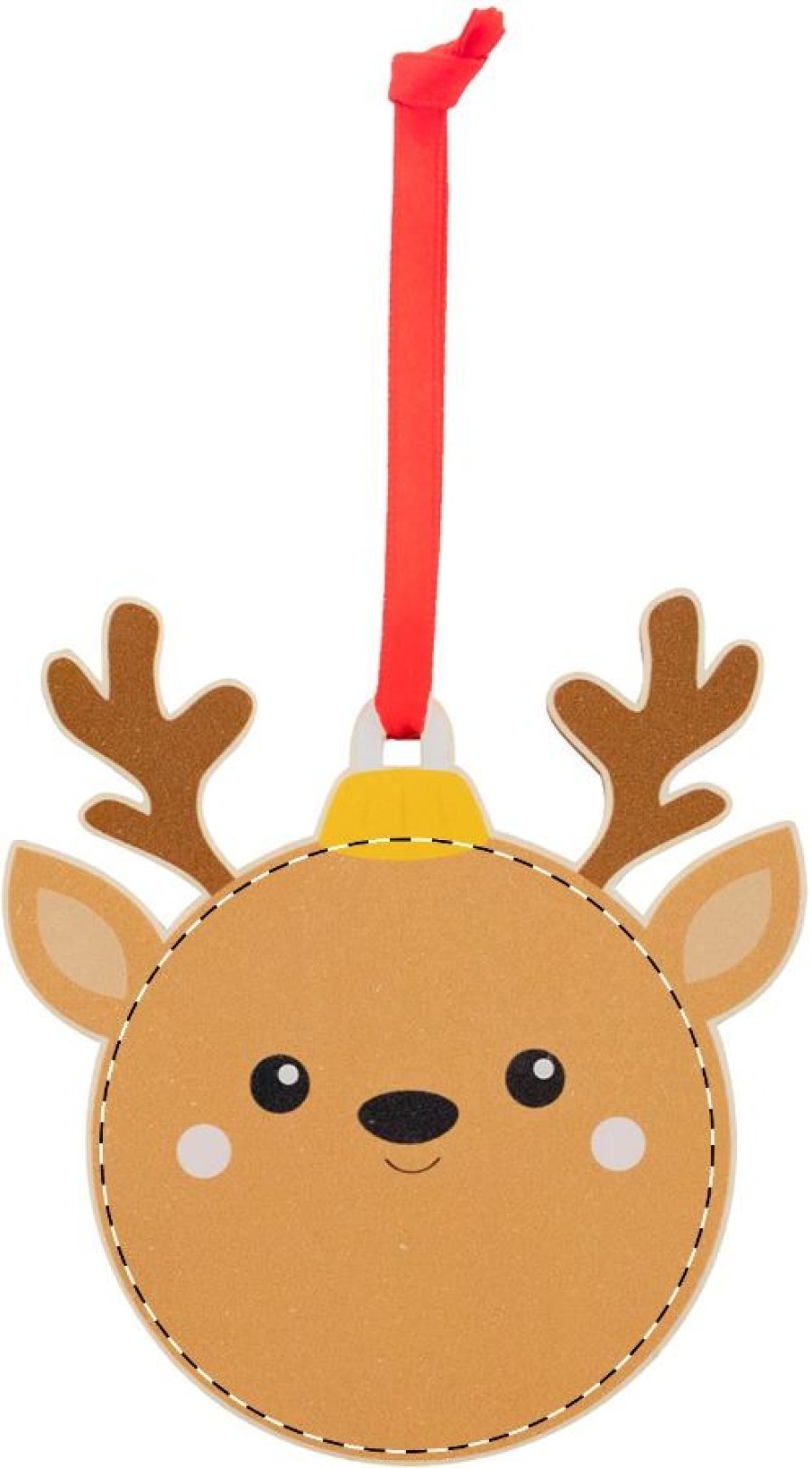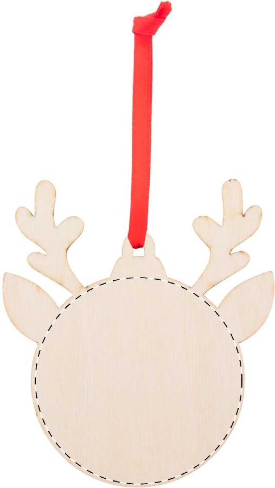 Vánoční ozdoba z březové překližky, s tištěným vánočním designem a červenou stužkou, která je dodávána zvlášť.