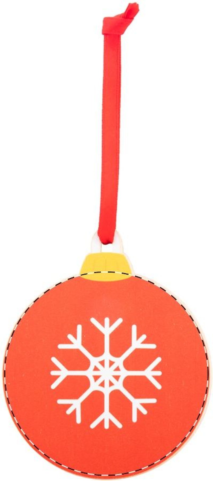 Vánoční ozdoba z březové překližky, s tištěným vánočním designem a červenou stužkou, která je dodávána zvlášť.