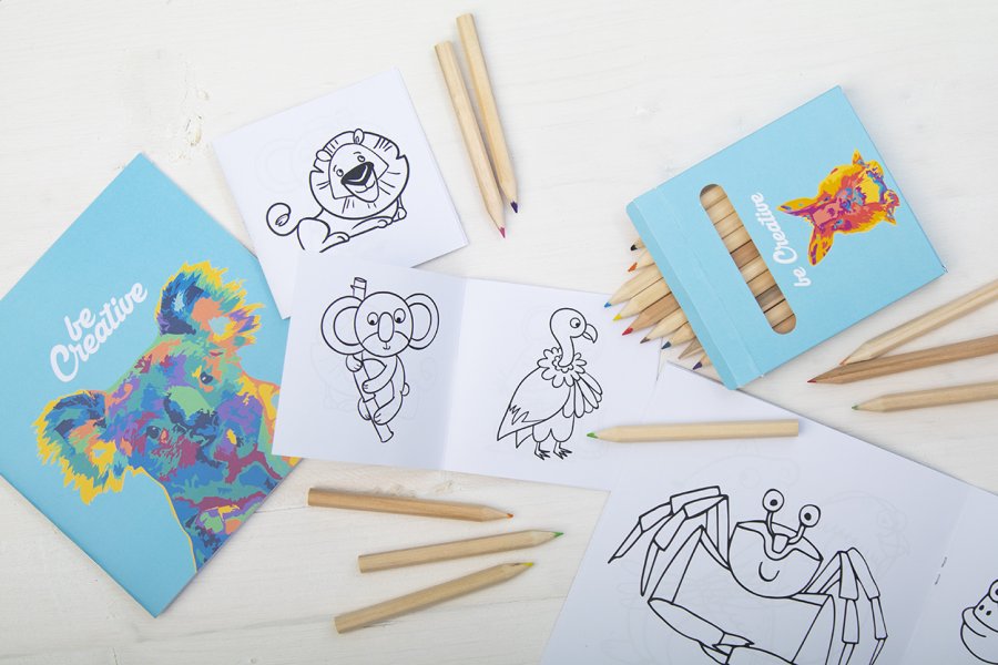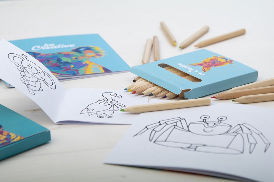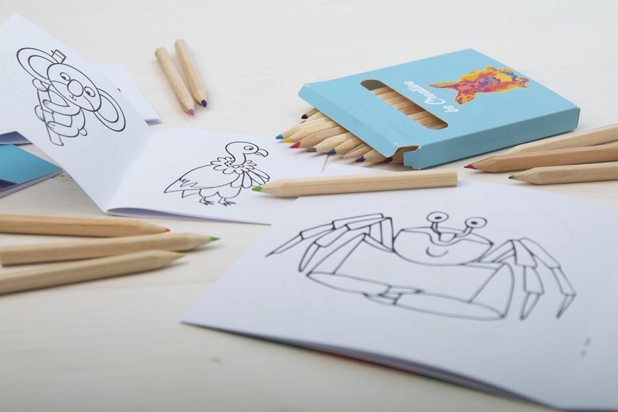 Sada na vybarvení na zakázku v celobarevně potištěné papírové krabičce. Včetně dřevěných pastelek (12 ks) a tématické omalovánky. Cena zahrnuje digitální tisk, nezahrnuje tiskovou přípravu. Min. mn.: 100 ks.