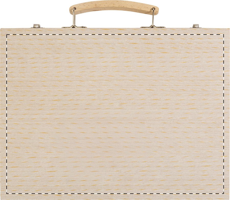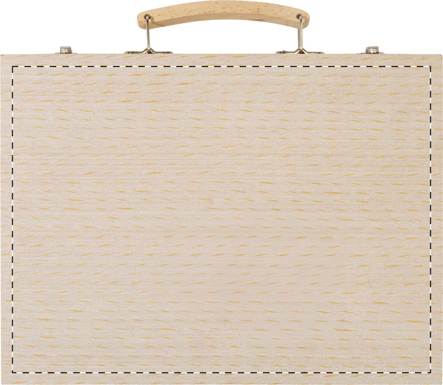 Komplexní 66dílná sada pro kreslení a vybarvování v dřevěné přepravní krabičce. Obsahuje: 12 voskovek, 12 olejových pastelů, 12 tužek, 12 fixů, 12 akvarelových barev s paletou a štětcem, pravítko, gumu, ořezávátko a lepidlo.