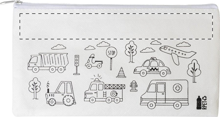Pouzdro na pera se zipem z netkané RPET tkaniny s 5 voskovkami na vybarvení.