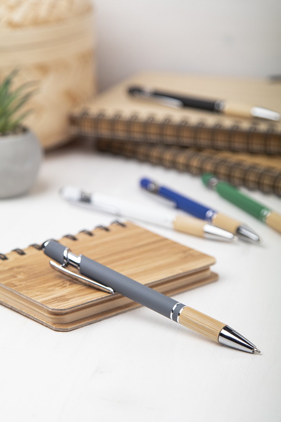 Hliníkové kuličkové a dotykové pero s bambusovým úchopem a pogumovaným povrchem. Se speciální vrstvou pro zrcadlové laserové gravírování. S modrou náplní.