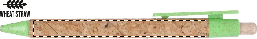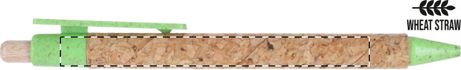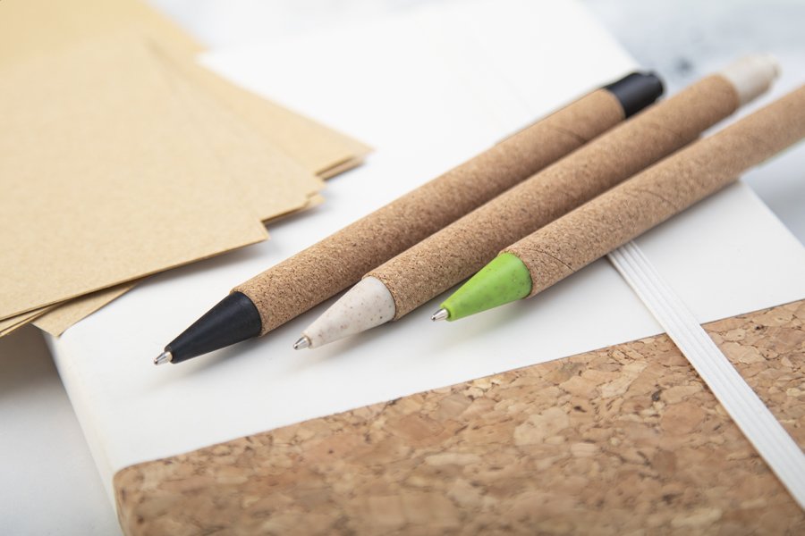 Ekologické plastové kuličkové pero ze slámy s přírodním korkem na těle a modrou náplní.
