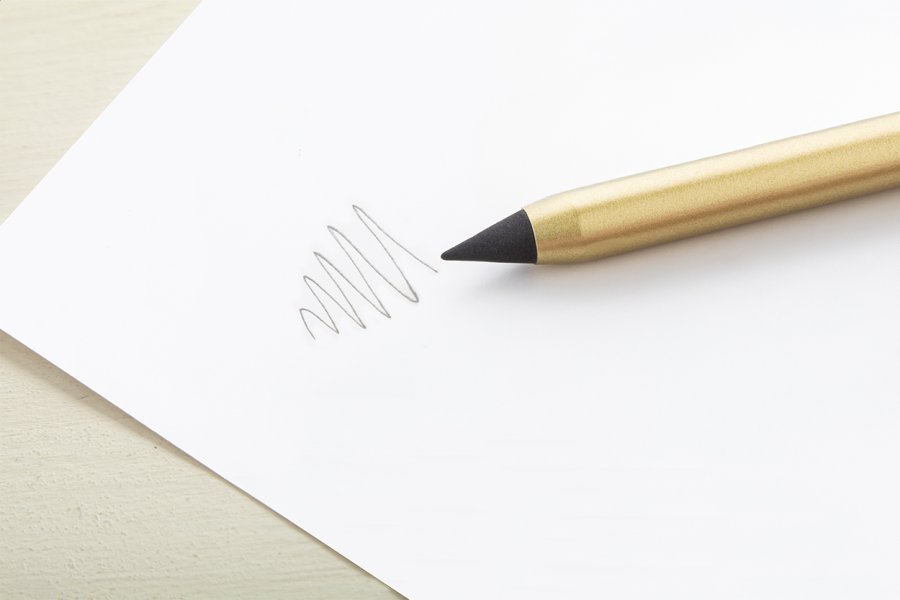 Bez inkoustové pero z recyklovaného hliníku s hrotem z kovové slitiny, který oxiduje papír. Toto pero píše podobně jako tužka a navíc je stíratelné.