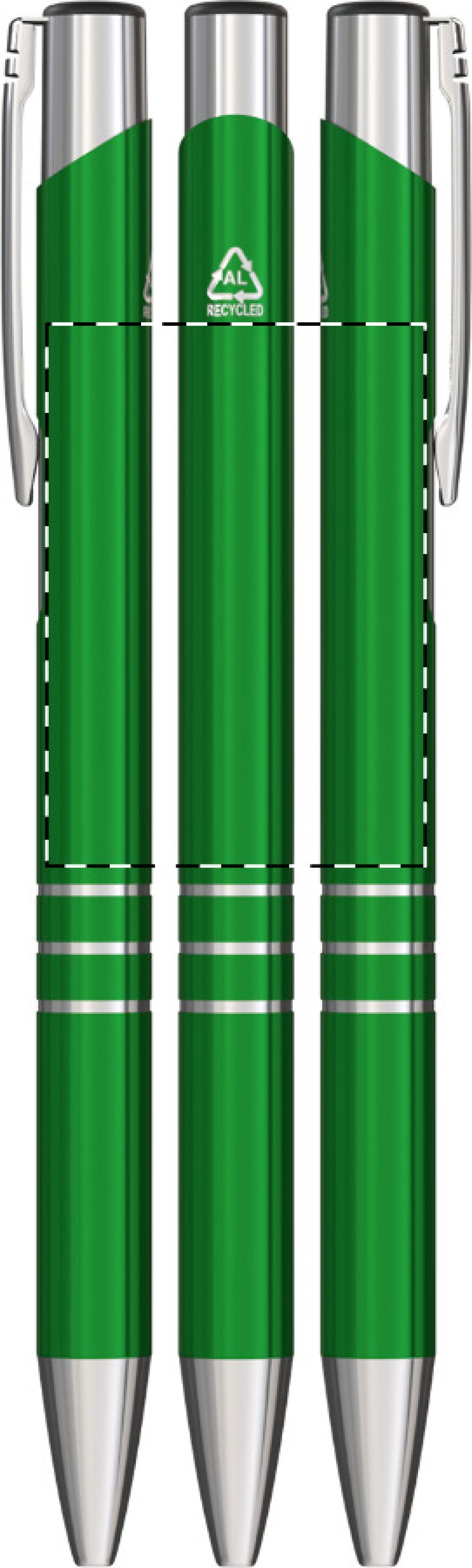 Kuličkové pero z recyklovaného hliníku s metalickým povrchem a modrou náplní.