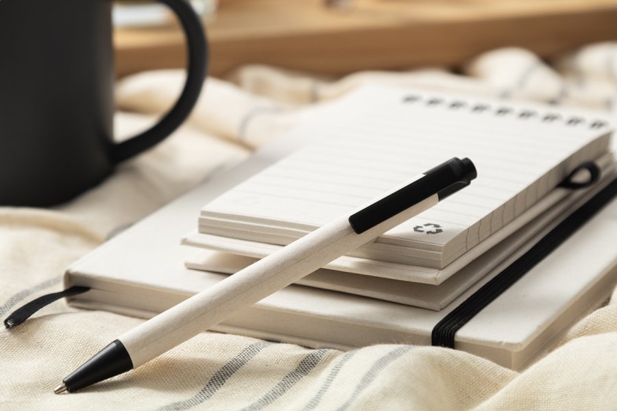 Kuličkové pero z recyklovaného kartonu na mléko s díly z recyklovaného ABS plastu. S modrou náplní.