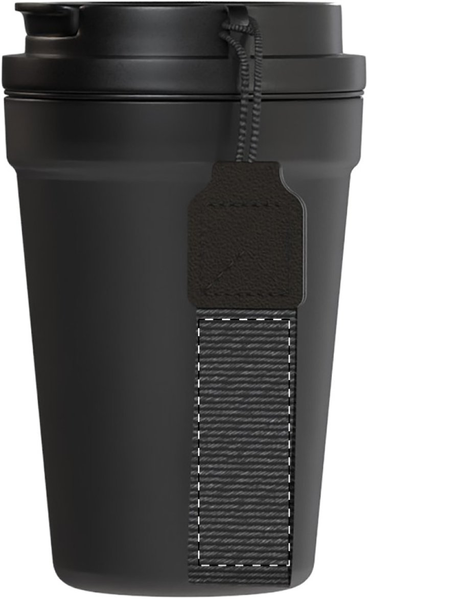 Jednostěnný cestovní kelímek z PP plastu s matnou povrchovou úpravou, víčkem na pití a poutkem z RPET polyesteru. 400 ml.