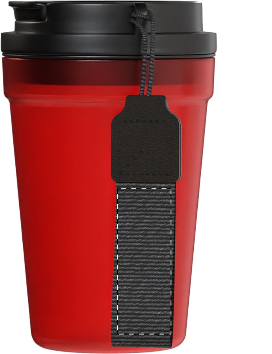 Jednostěnný cestovní kelímek z PP plastu s matnou povrchovou úpravou, víčkem na pití a poutkem z RPET polyesteru. 400 ml.