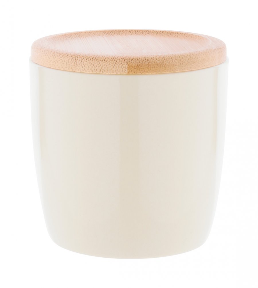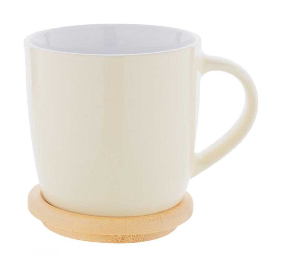 Vysoce kvalitní barevný keramický hrnek s bílým vnitřkem a bambusovým podtáckem, 370 ml. V kraftové papírové krabici.