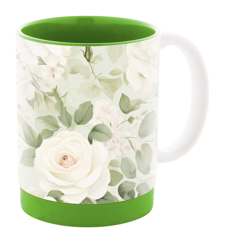 Keramický hrnek na sublimaci s barevným vnitřkem a silikonovým kroužkem v odpovídající barvě, 300 ml. V bílé papírové krabici.