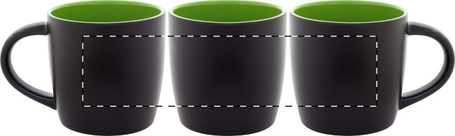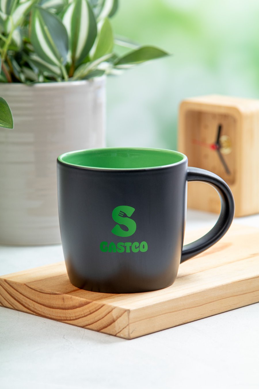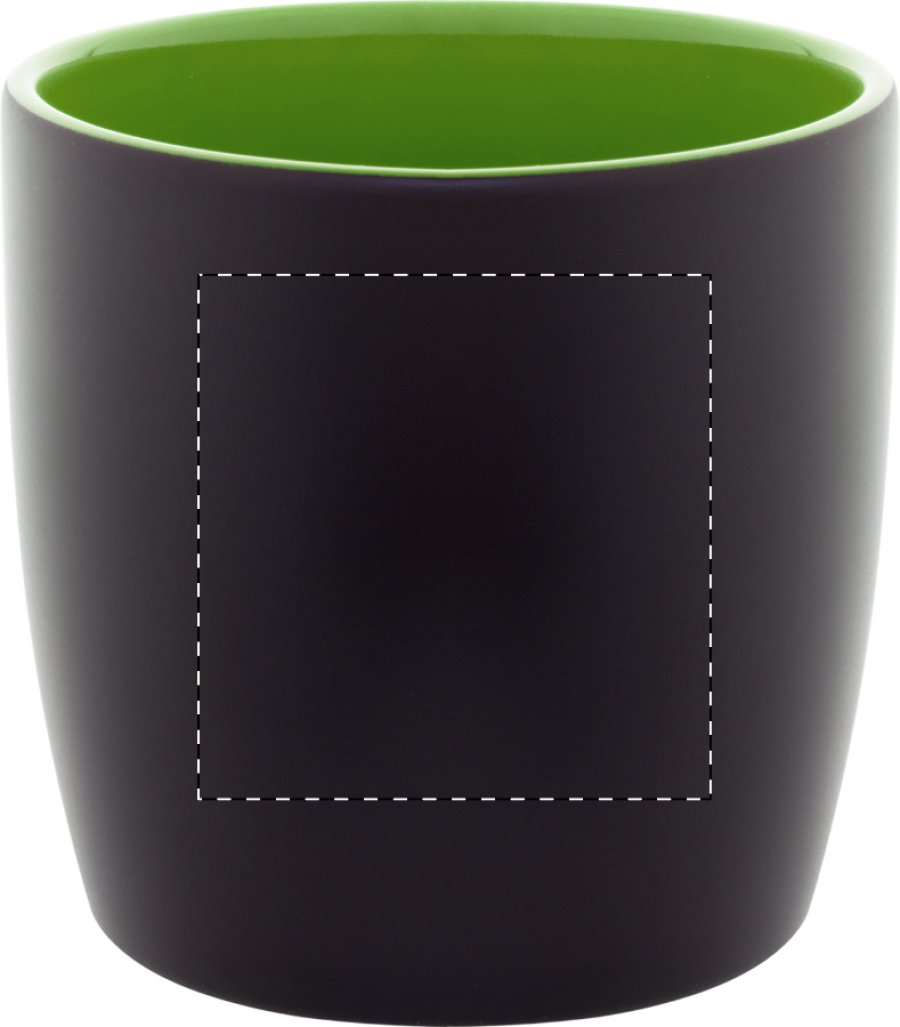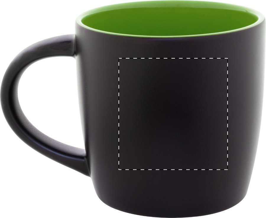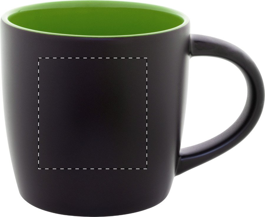 Černý keramický hrnek s barevným vnitřkem, 300 ml. Se speciální vrstvou pro gravírování, gravírované logo ladí s vnitřní barvou. V kraftové papírové krabici.