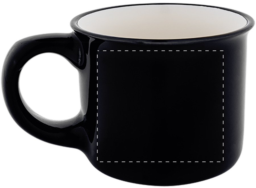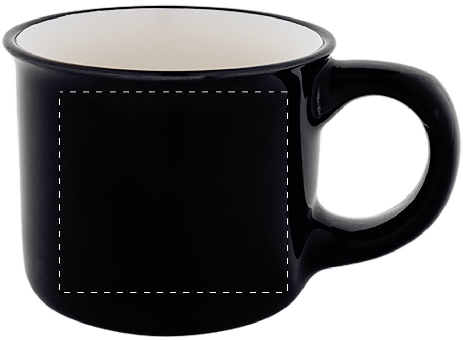 Mini vintage keramický hrnek s černým okrajem, bílým uvnitř a barevným vnějškem, 90 ml. V krabičce z kraftového papíru.