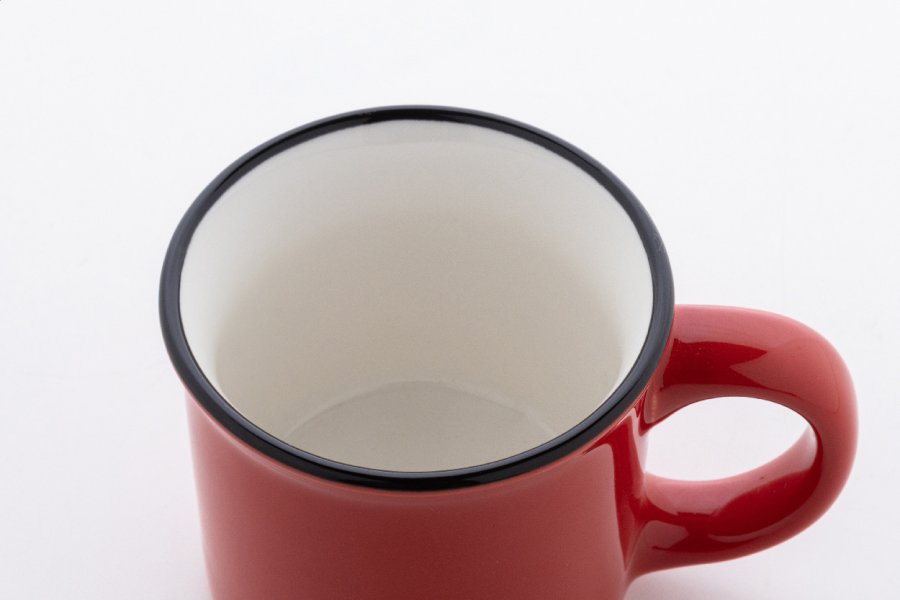 Mini vintage keramický hrnek s černým okrajem, bílým uvnitř a barevným vnějškem, 90 ml. V krabičce z kraftového papíru.