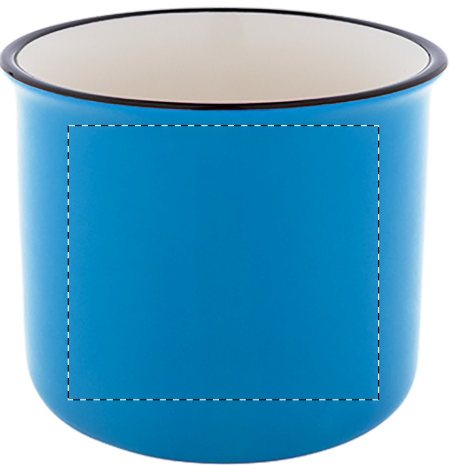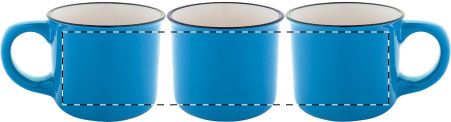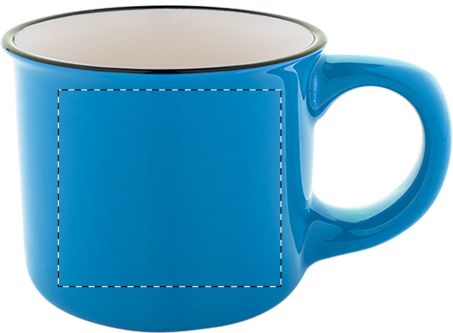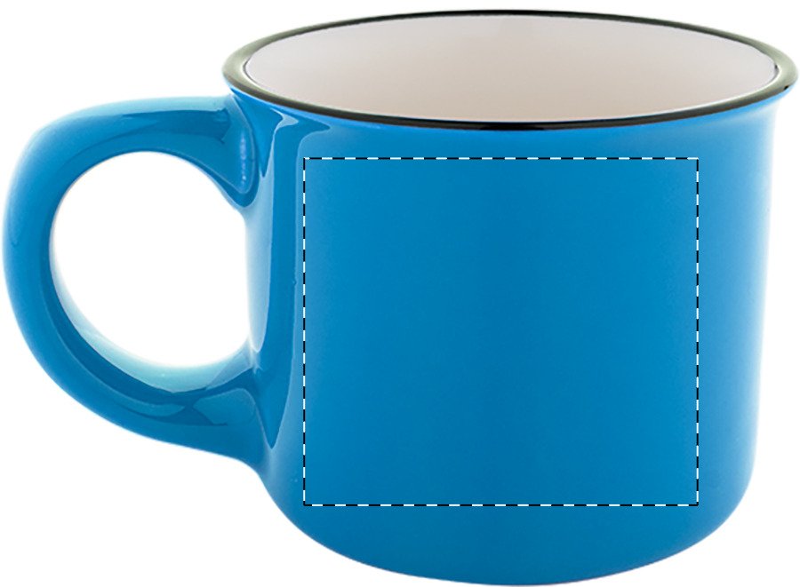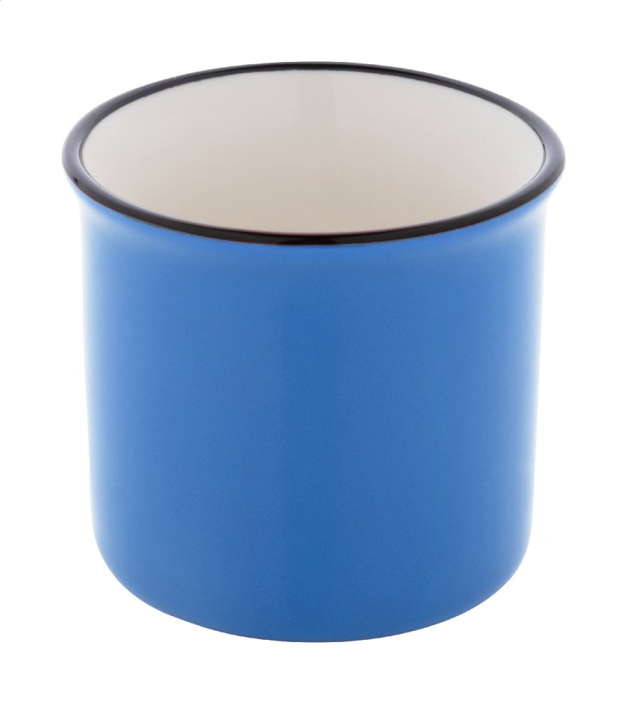 Mini vintage keramický hrnek s černým okrajem, bílým uvnitř a barevným vnějškem, 90 ml. V krabičce z kraftového papíru.