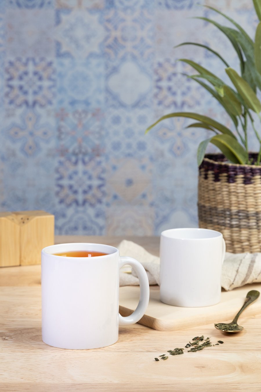 Bílý keramický hrnek pro sublimační potisk vhodný do myčky na nádobí, 300 ml. V bílé papírové krabici.