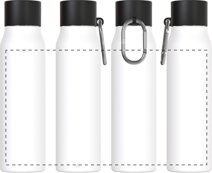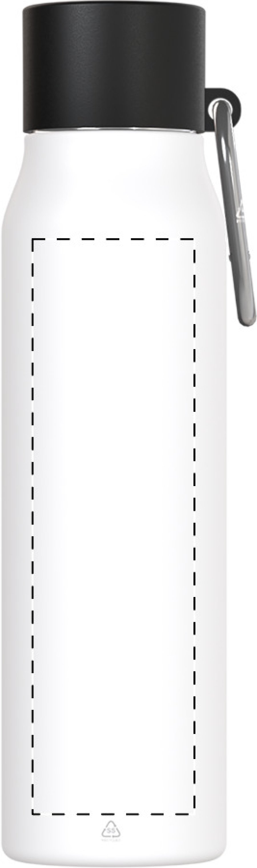 Dvoustěnná vakuová láhev z recyklované nerezové oceli s víčkem z PP a karabinou z recyklovaného hliníku. 500 ml.