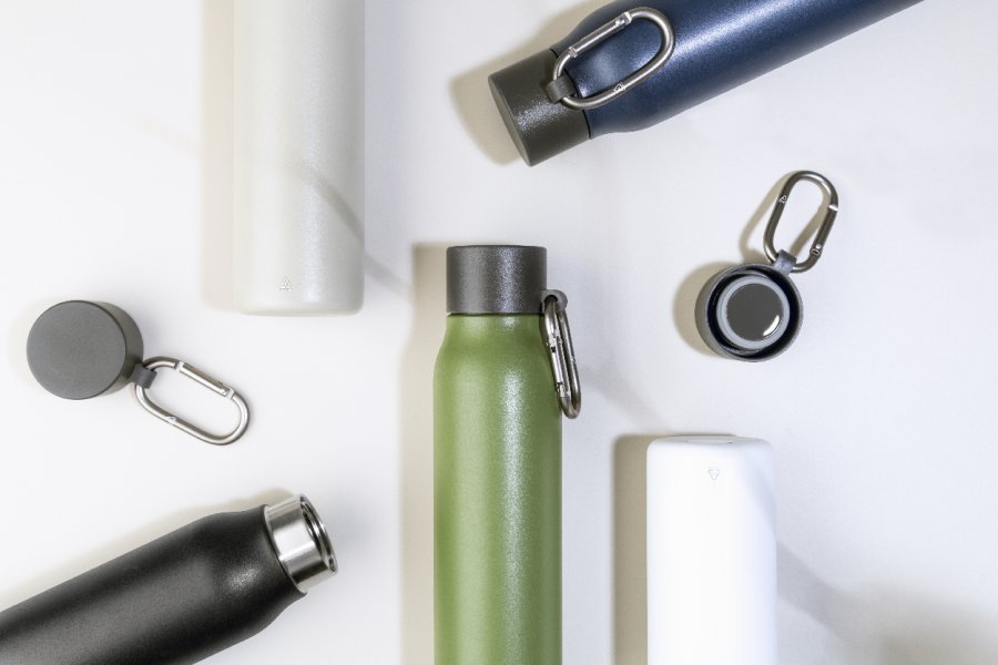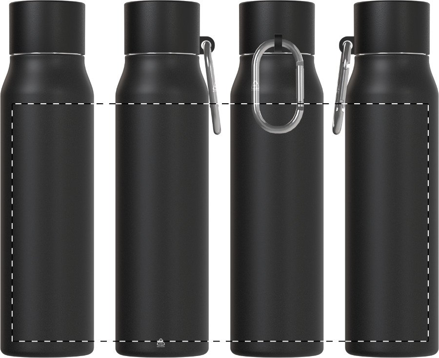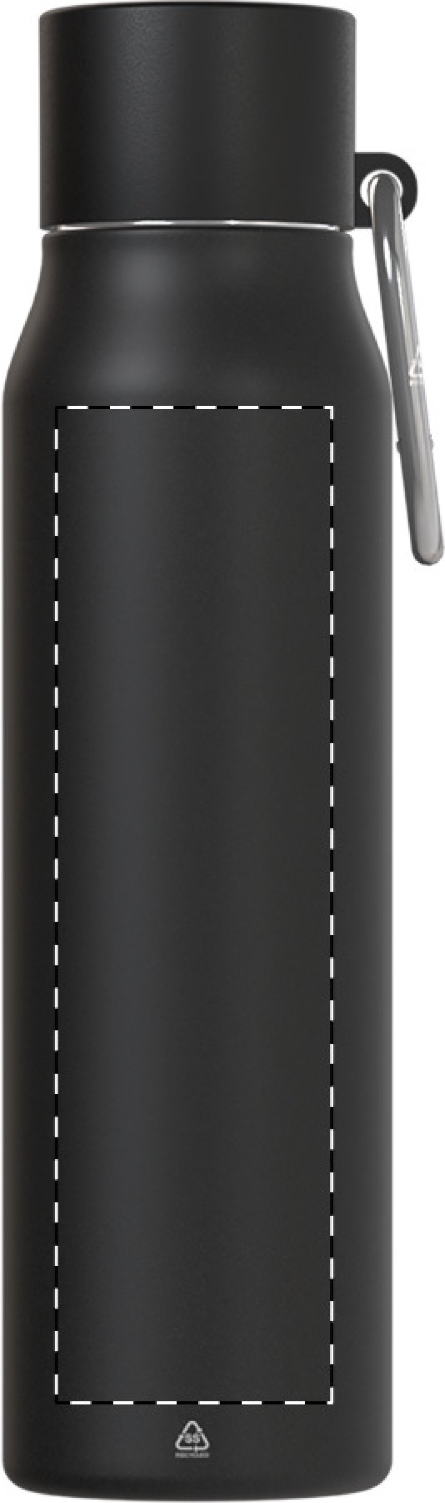 Dvoustěnná vakuová láhev z recyklované nerezové oceli s víčkem z PP a karabinou z recyklovaného hliníku. 500 ml.