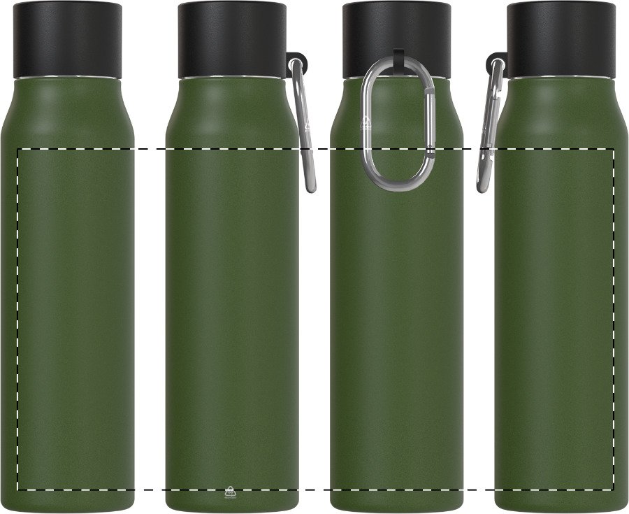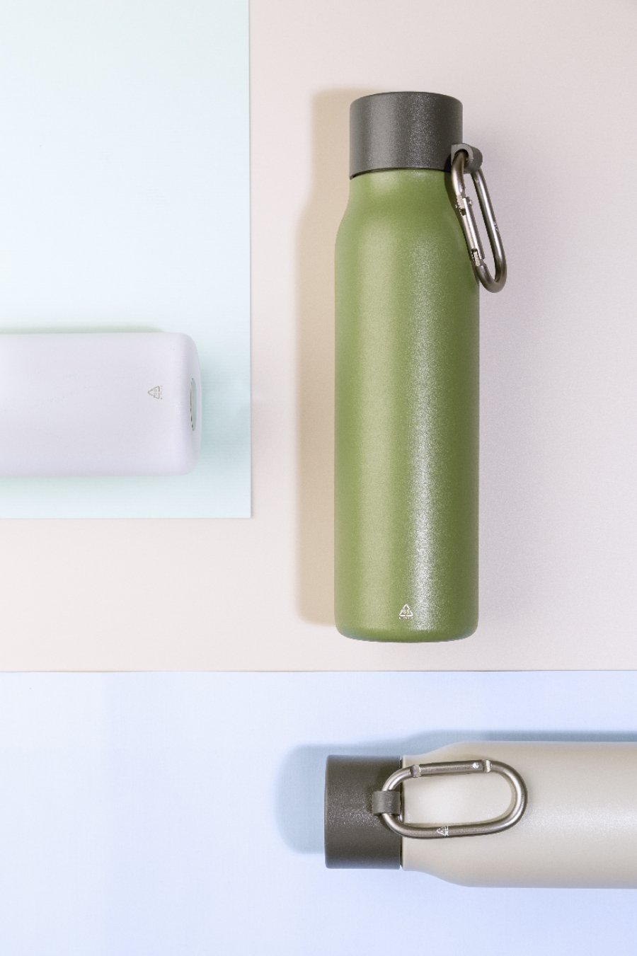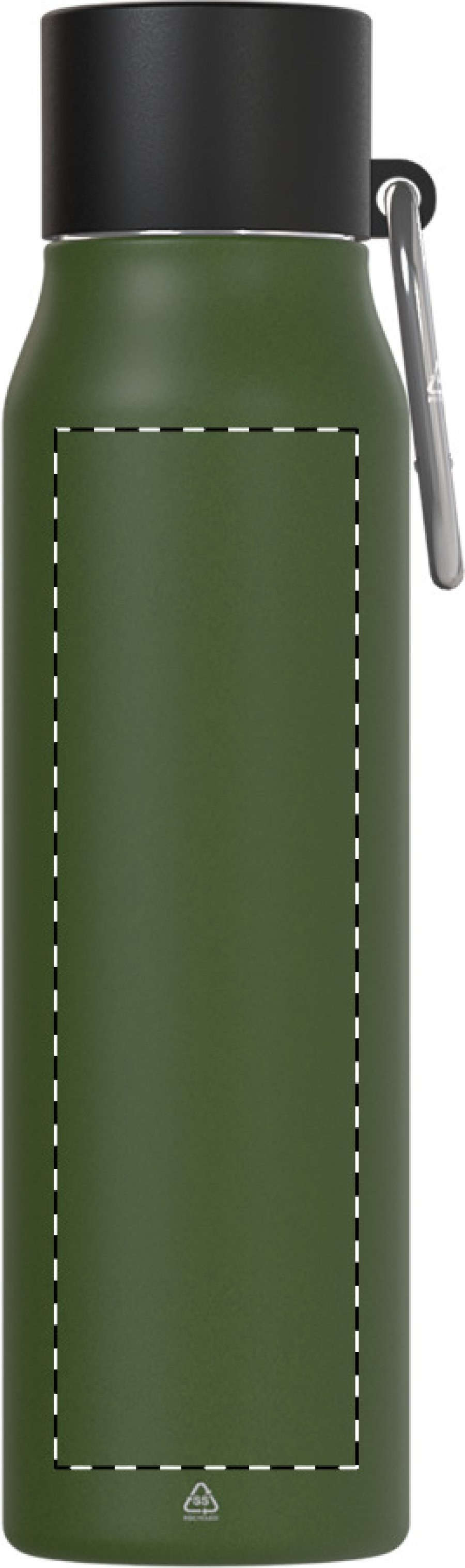 Dvoustěnná vakuová láhev z recyklované nerezové oceli s víčkem z PP a karabinou z recyklovaného hliníku. 500 ml.