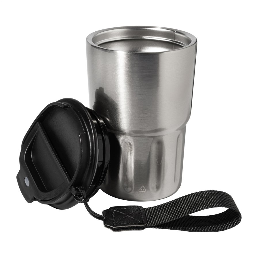 Dvoustěnný termo hrnek z recyklované nerezové oceli s izolačním víčkem z PP. S poutkem z RPET polyesteru. 350 ml.