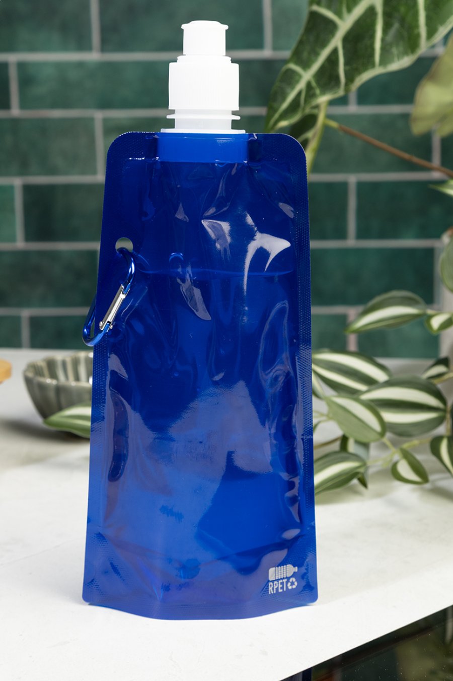 Skládací sportovní láhev z RPET s víčkem na pití a hliníkovou karabinou, 500 ml. Bez BPA. Nevhodná pro sycené nápoje.