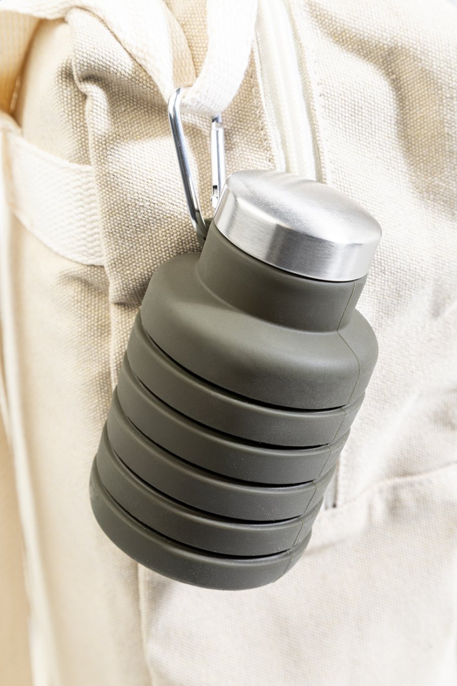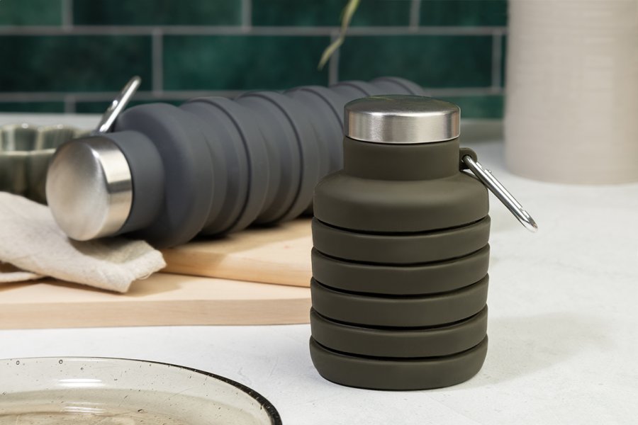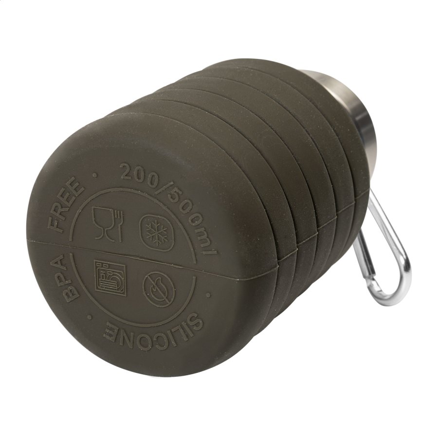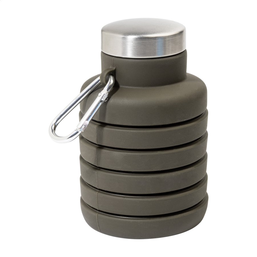 Skládací silikonová láhev s víčkem z nerezové oceli a hliníkovou karabinou. 500 ml
