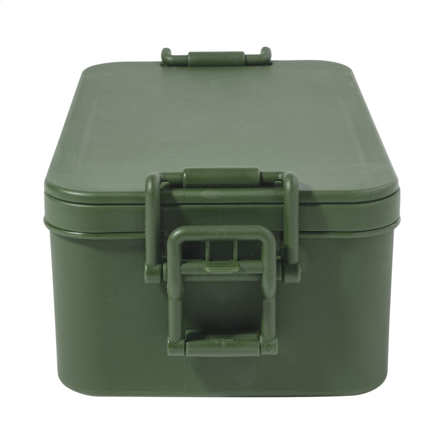 Box na jídlo z PP plastu se sadou příborů (vidlička, lžíce a nůž), zapínáním na přezku a 2 přihrádkami (1000 ml a 800 ml). Stohovatelný design pro kompaktní skladování.