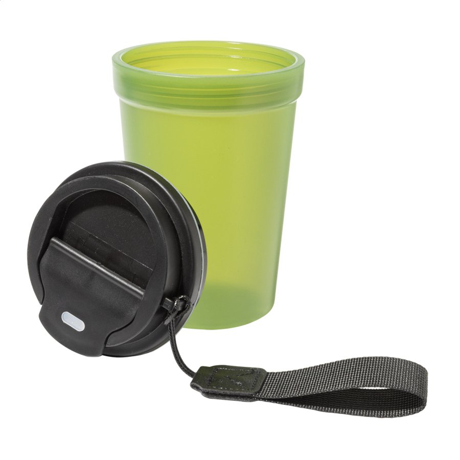 Jednostěnný cestovní kelímek z PP plastu s matnou povrchovou úpravou, víčkem na pití a poutkem z RPET polyesteru. 400 ml.