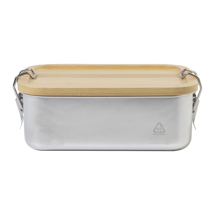 Box na jídlo z recyklované nerezové oceli s bambusovým víkem a bezpečným zapínáním na přezku, 750 ml.