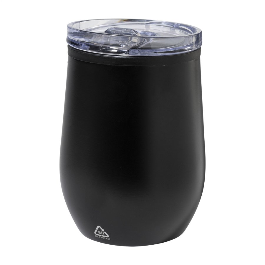 Dvoustěnný termo hrnek z recyklované nerezové oceli s vnitřní stranou z PP a víčkem z PS. 350 ml.