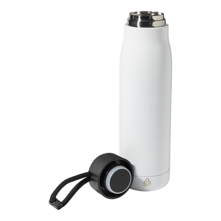 Dvoustěnná, vakuově izolovaná láhev z recyklované nerezové oceli s PP víčkem a integrovaným poutkem na nošení se šňůrkou. 500 ml.