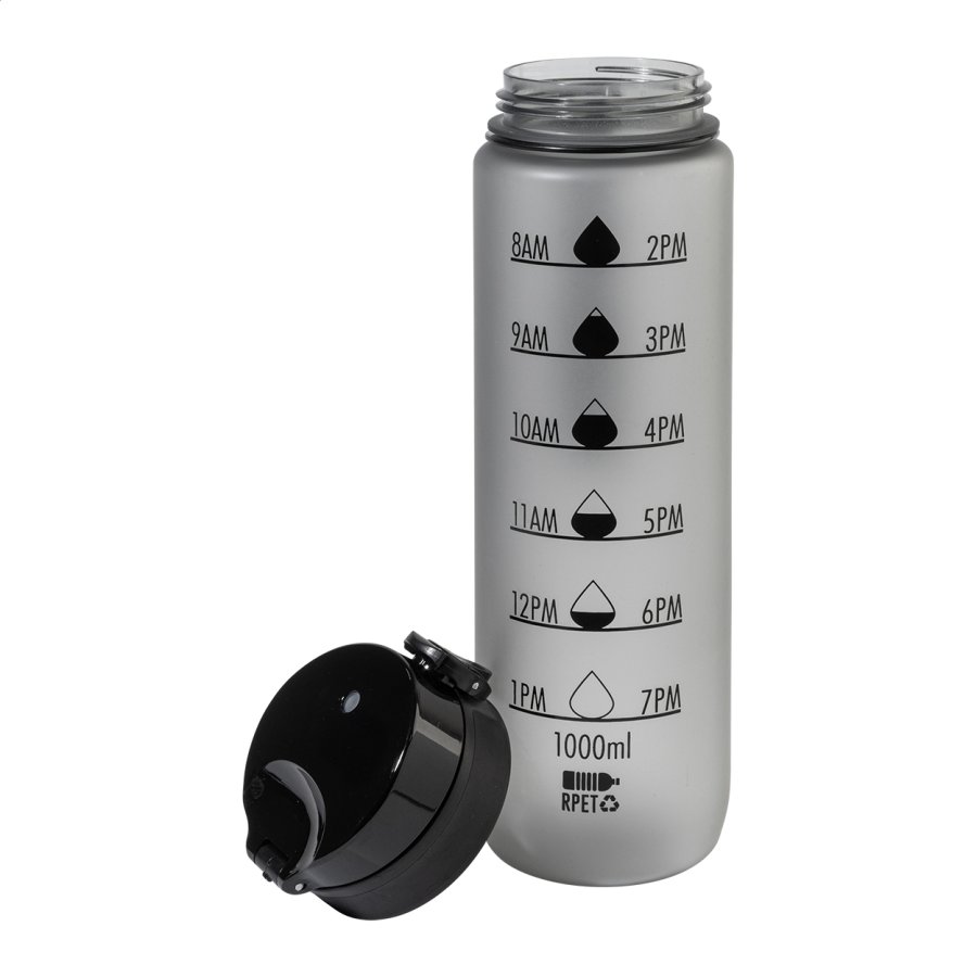 Sportovní láhev z matného RPET s motivačním objemovým a časovým značením, s automaticky otevíratelným odklápěcím víčkem s bezpečnostním zámkem a poutkem na nošení. 1000 ml. Bez BPA. Nevhodné pro sycené nápoje.