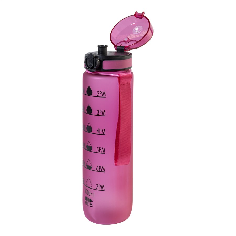 Sportovní láhev z matného RPET s motivačním objemovým a časovým značením, s automaticky otevíratelným odklápěcím víčkem s bezpečnostním zámkem a poutkem na nošení. 1000 ml. Bez BPA. Nevhodné pro sycené nápoje.