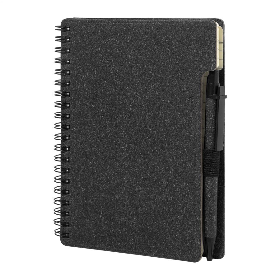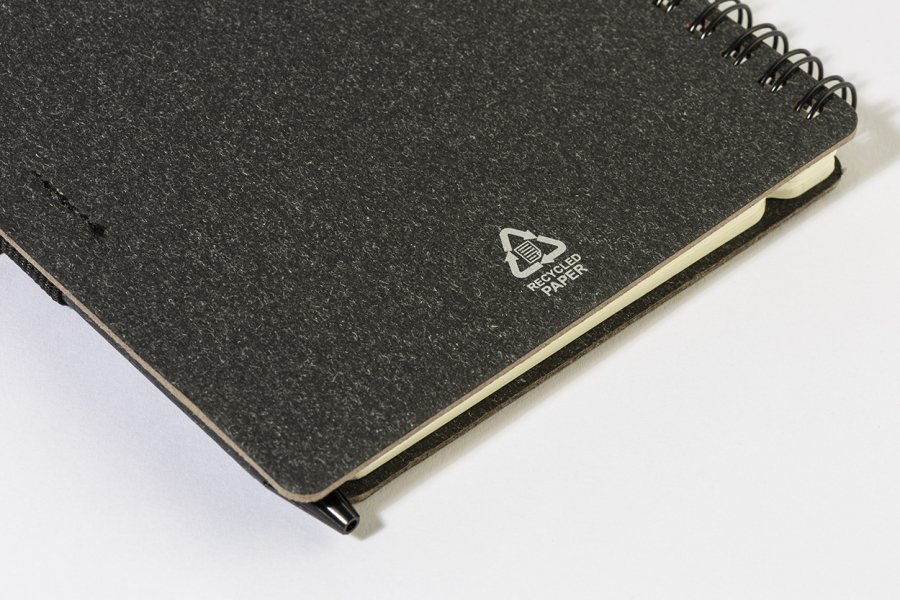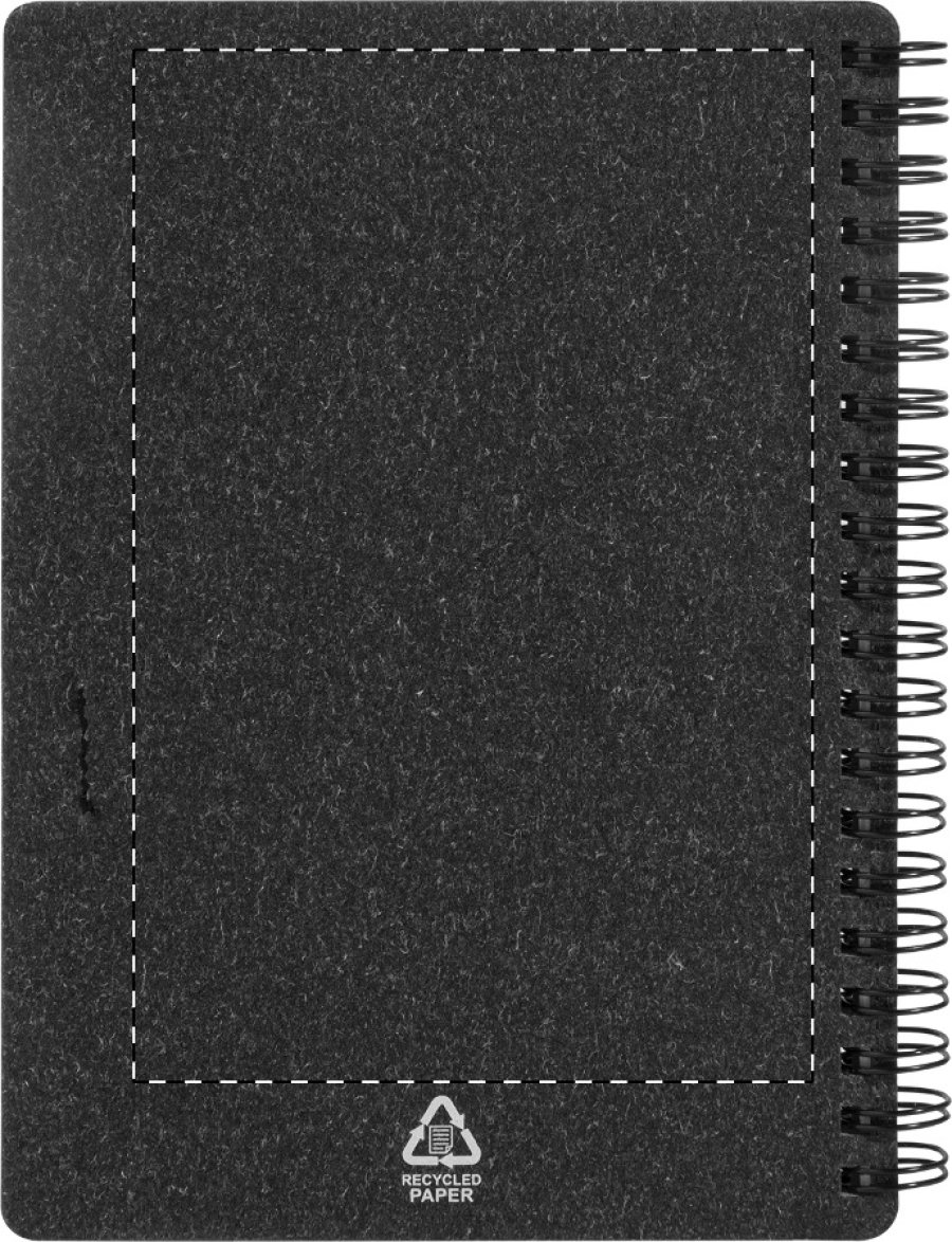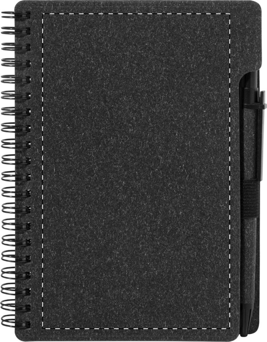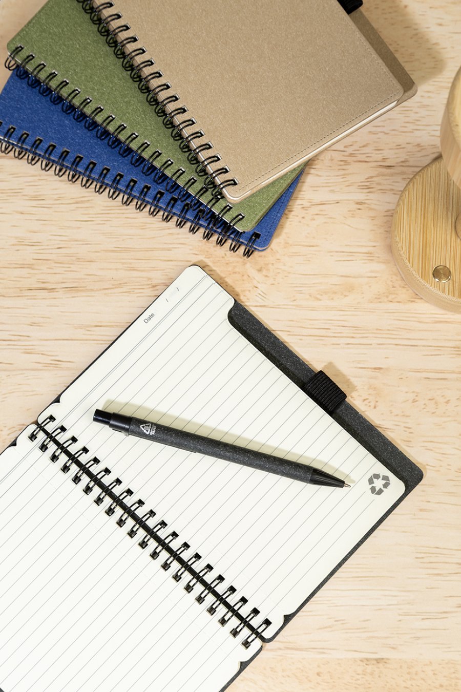 Spirálový blok A6 z recyklovaného papíru s 80 linkovanými listy. Včetně recyklovaného papíru a kuličkového pera z recyklovaného PP s modrou náplní.