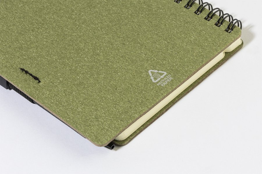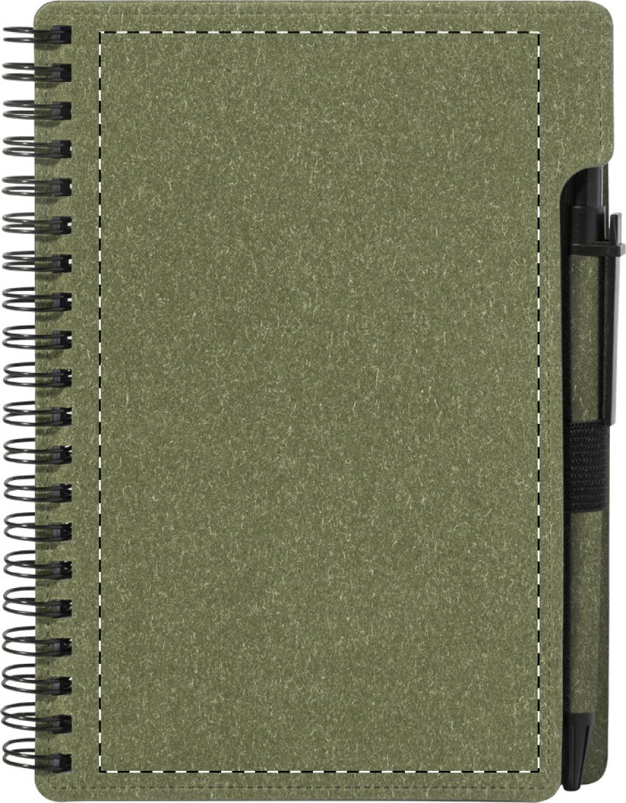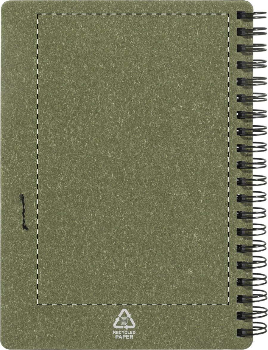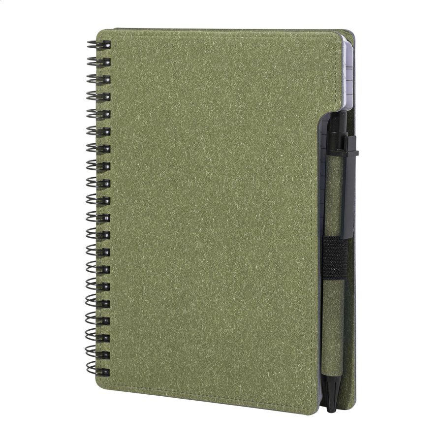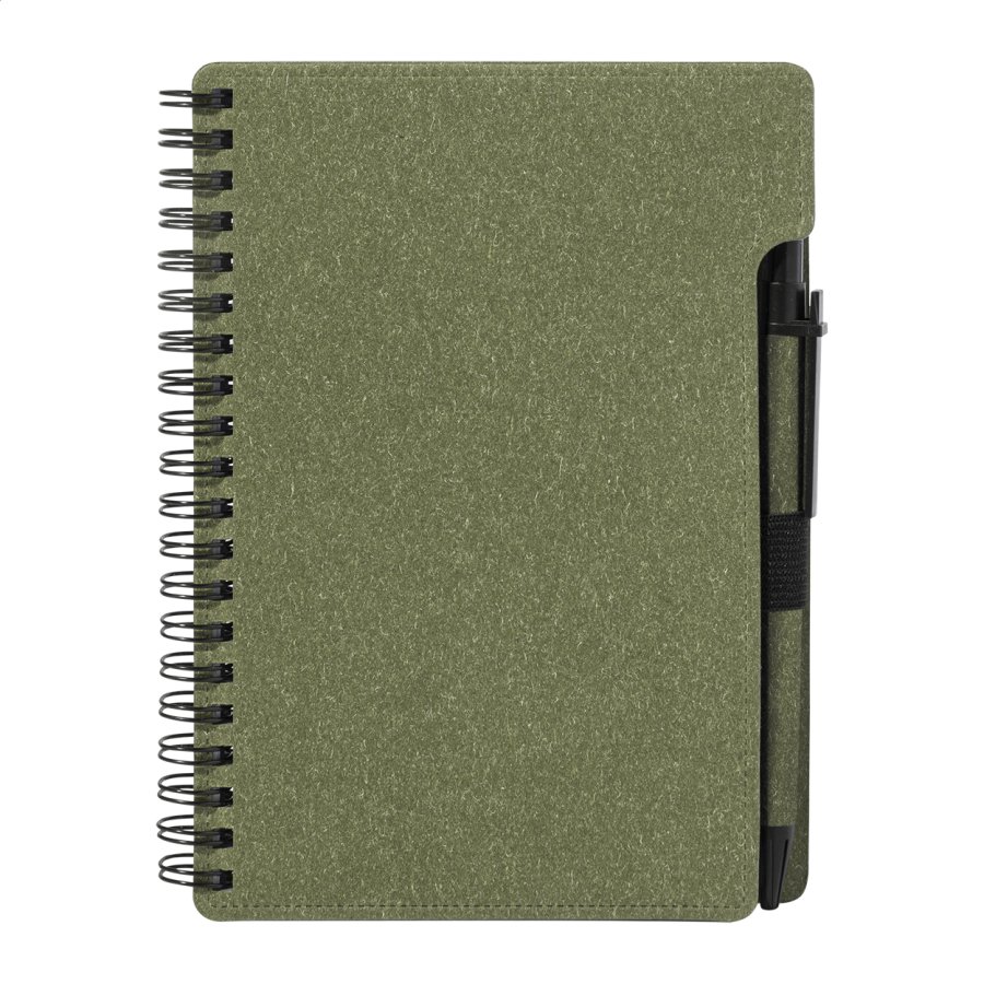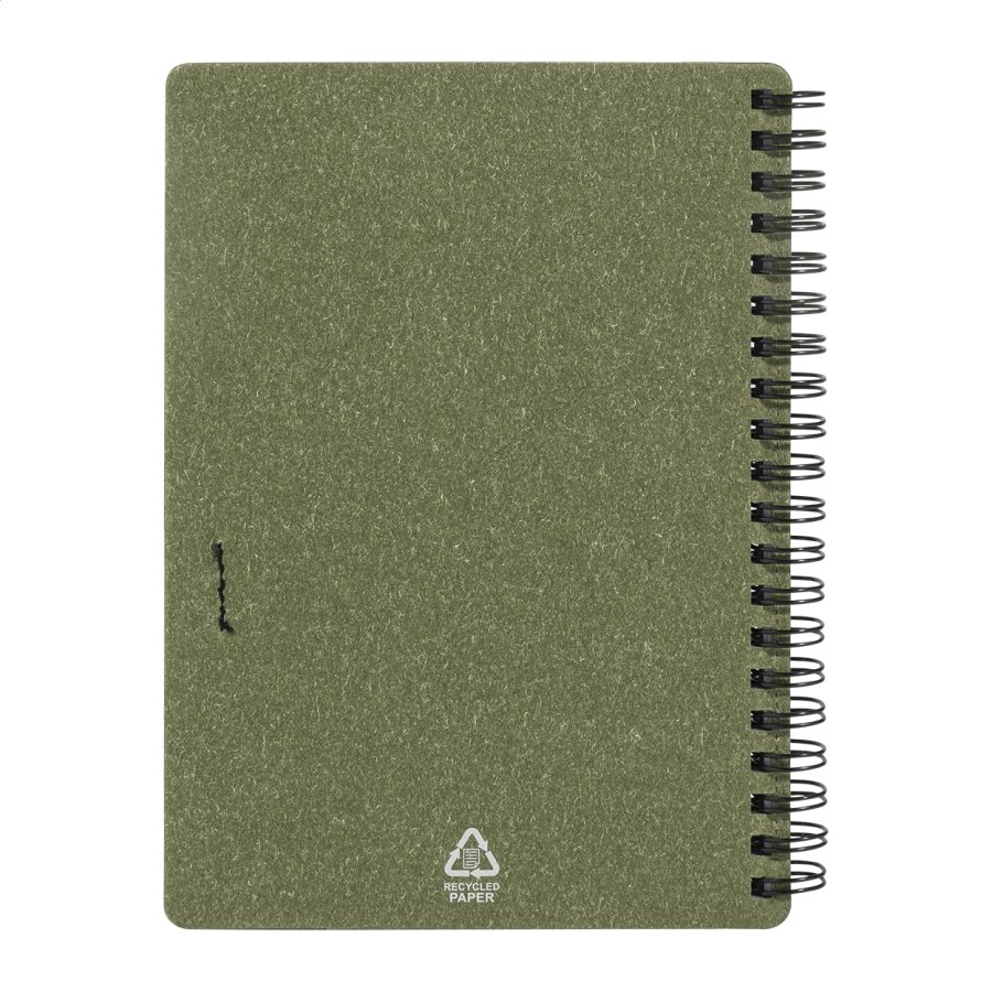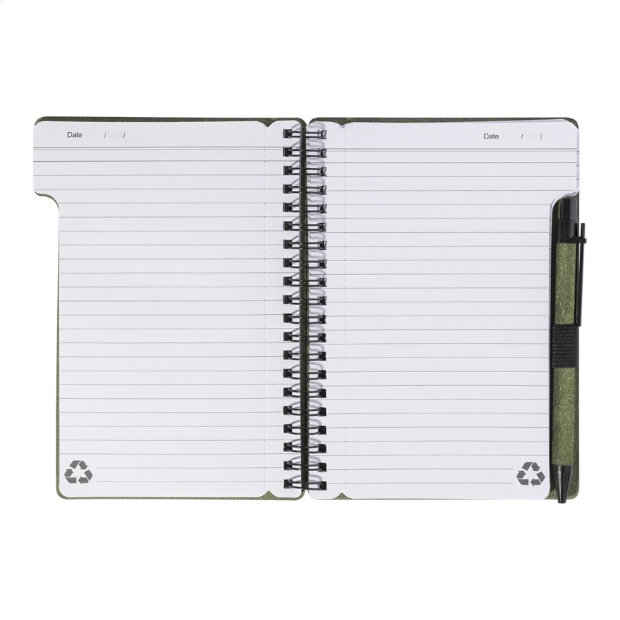 Spirálový blok A6 z recyklovaného papíru s 80 linkovanými listy. Včetně recyklovaného papíru a kuličkového pera z recyklovaného PP s modrou náplní.
