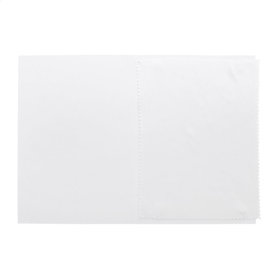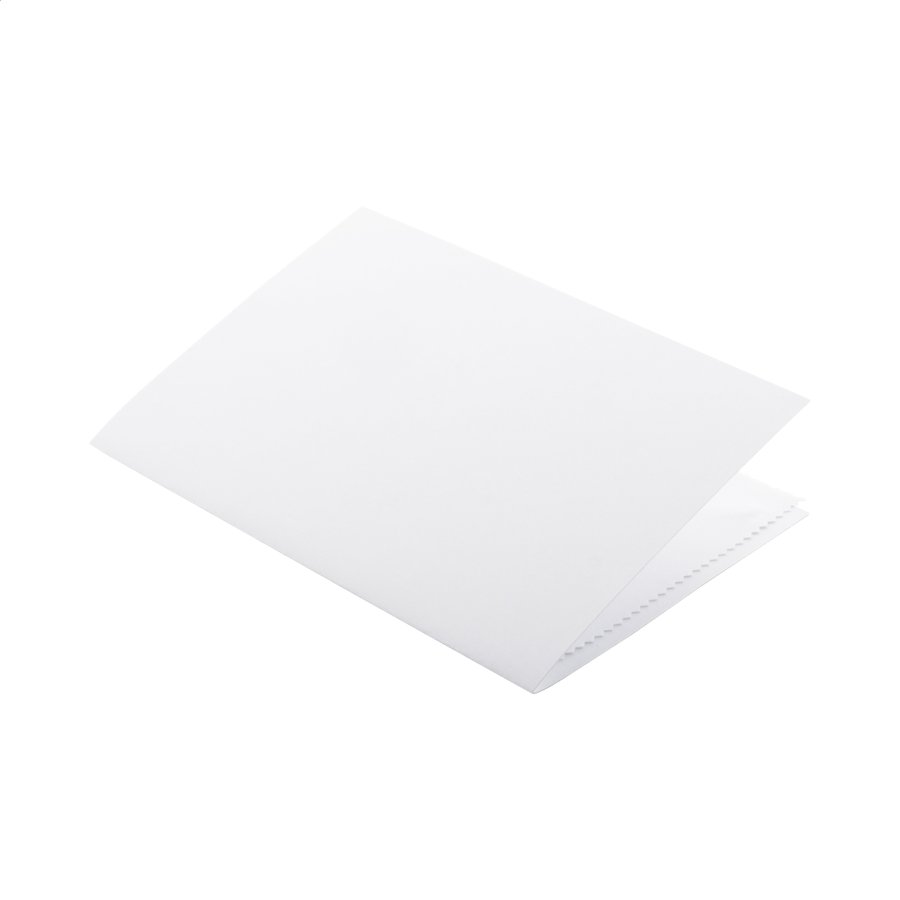 Papírová pohlednice s vlastní grafikou na obou stranách. Vč. čistícího hadříku na brýle (180 g/m²) z mikrovlákna se sublimačním potiskem. Cena zahrnuje digitální a sublimační tisk, nezahrnuje tiskovou přípravu. Min. mn.: 100 ks.