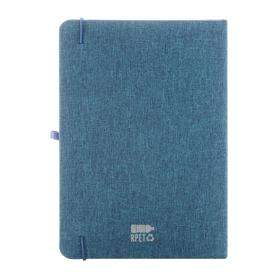 Blok A5 potažený polyesterem 300D RPET s 80 čistými listy. S gumovým páskem, záložkou a držákem na pero.
