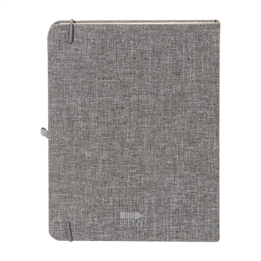 Blok A5 potažený polyesterem 300D RPET s 80 čistými listy. S gumovým páskem, záložkou a držákem na pero.