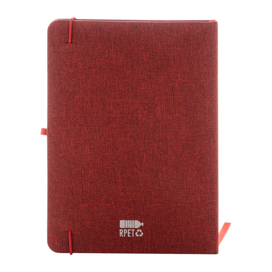 Blok A5 potažený polyesterem 300D RPET s 80 čistými listy. S gumovým páskem, záložkou a držákem na pero.