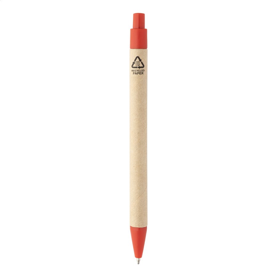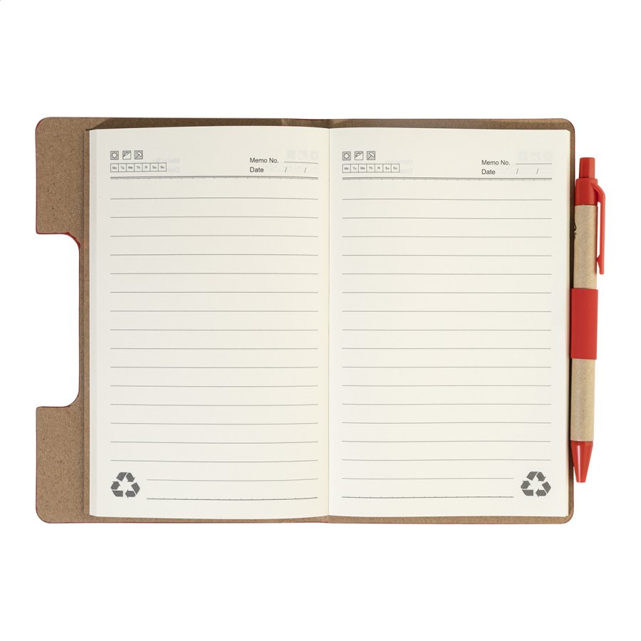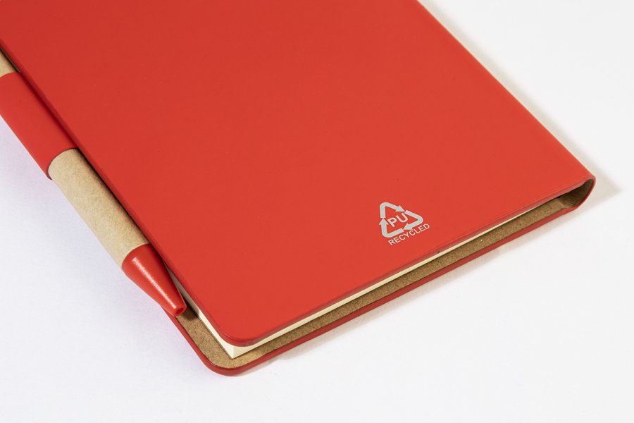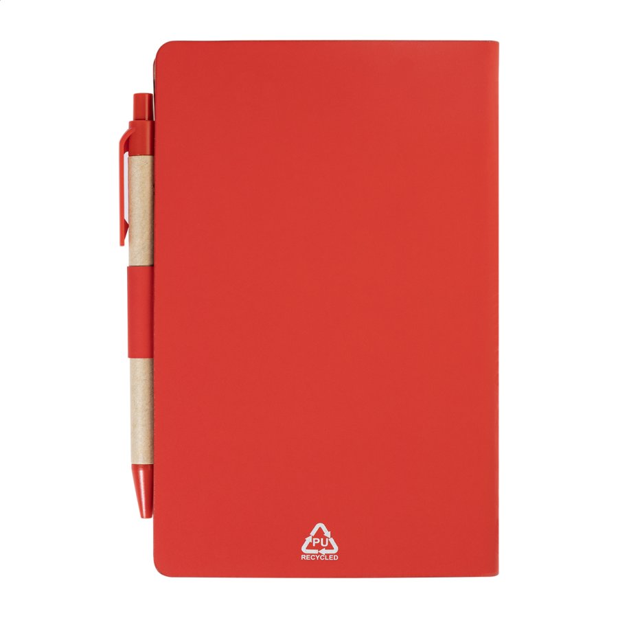 Blok s recyklovanou PU kůží, 70 linkovanými listy z recyklovaného papíru a 125 značkovači stránek (v 5 různých barvách). Včetně recyklovaného papíru a kuličkového pera z recyklovaného PP s modrou náplní.