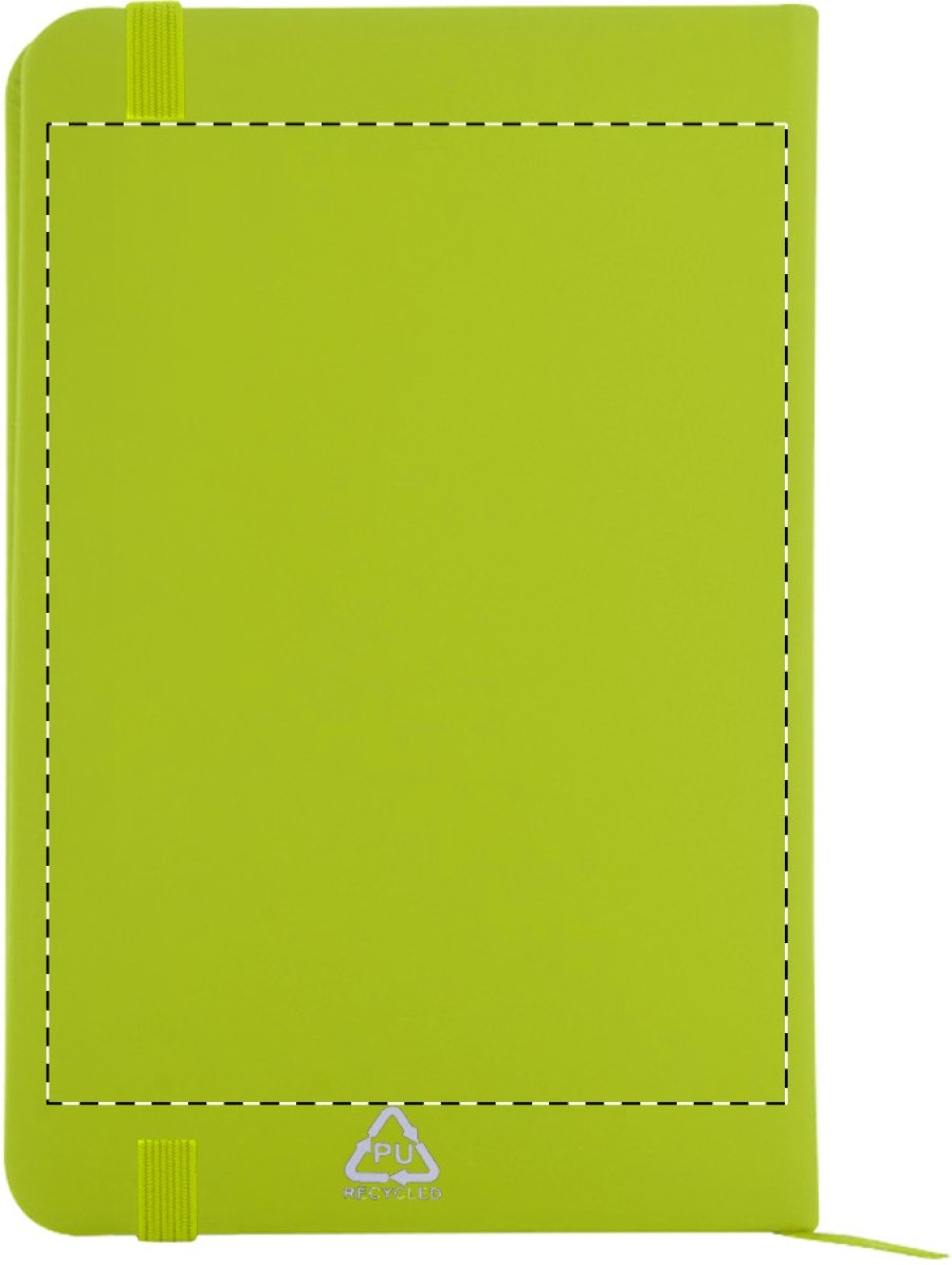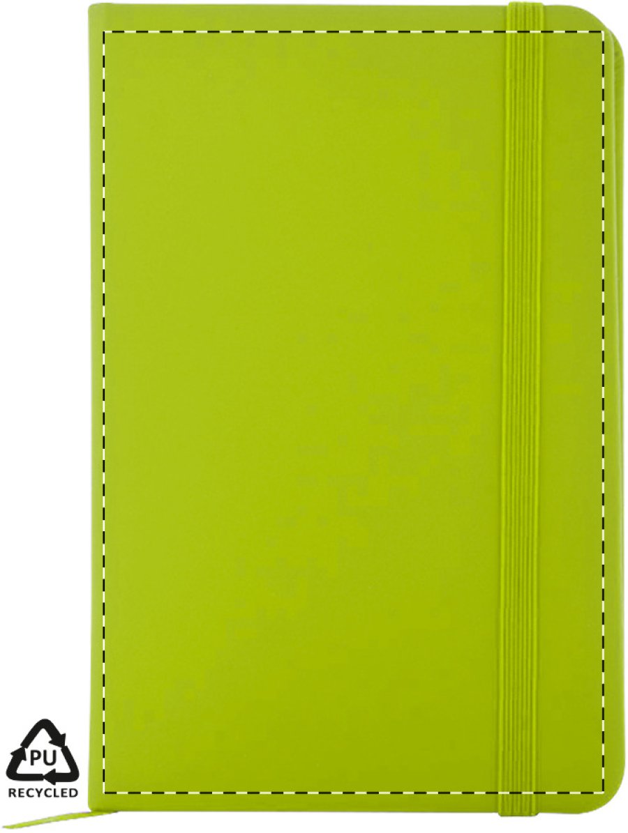 Blok potažený recyklovanou PU kůží se 100 linkovanými listy z recyklovaného papíru. Se záložkou v odpovídající barvě a gumičkou. Velikost A6.