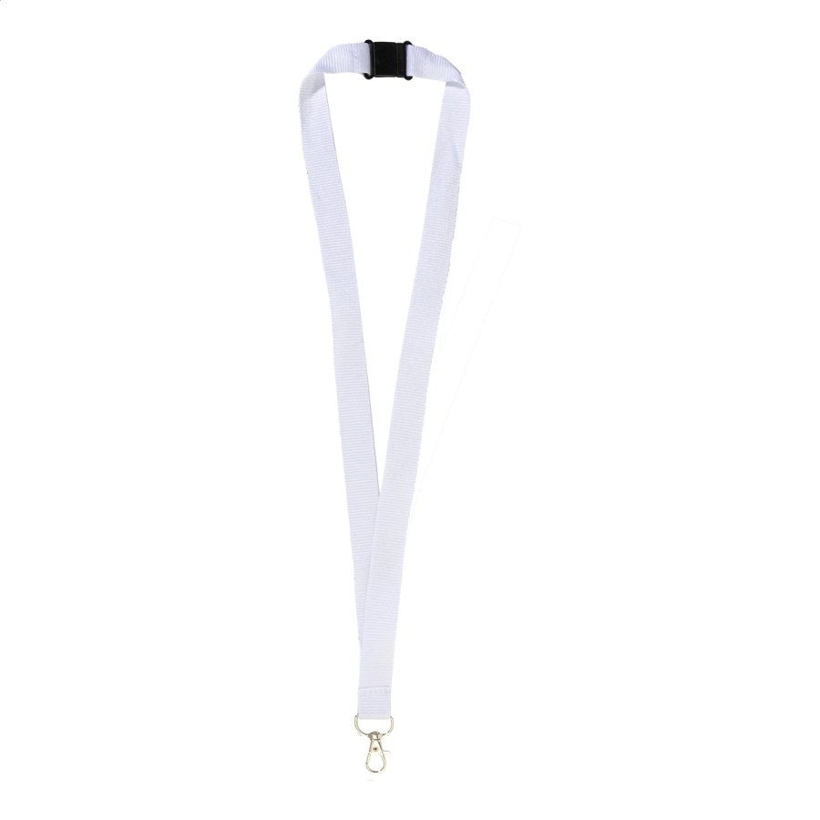 Polyesterový lanyard s kovovou karabinkou a bezpečnostní přezkou.