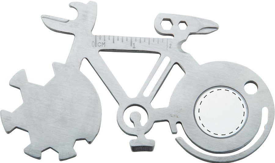 Multifunkční nářadí ve tvaru kola z nerezové oceli s 11 funkcemi.